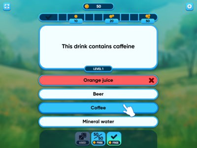 - Llena la barra de progreso respondiendo preguntas correctamente para desbloquear más pistas.